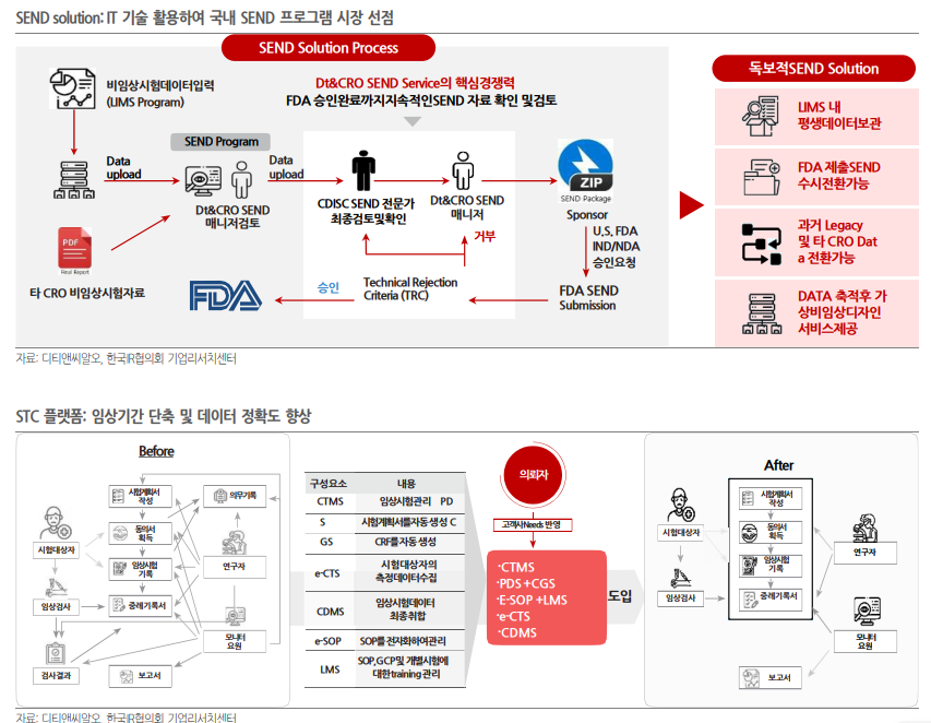 디티앤씨알오는 독자적으로 개발한 Bio/ICT 융합모델인 SEND(FDA 표준자료제출)와 STC(혁신 스마트 임상시험) 플랫폼을 통해 국내 CRO 시장을 선도할 전망입니다. 동사는 CRO Full-service가 가능한 시험센터들을 보유하고 있으며, SEND 및 STC와 같은 IT 플랫폼 기술 확보를 통해 선진화된 CRO 사업을 준비하고 있습니다. 향후 신약 개발을 위한 Full-service CRO 서비스가 필요한 많은 바이오 벤처 및 제약회사들의 수주가 이어질 것으로 예상됩니다.
